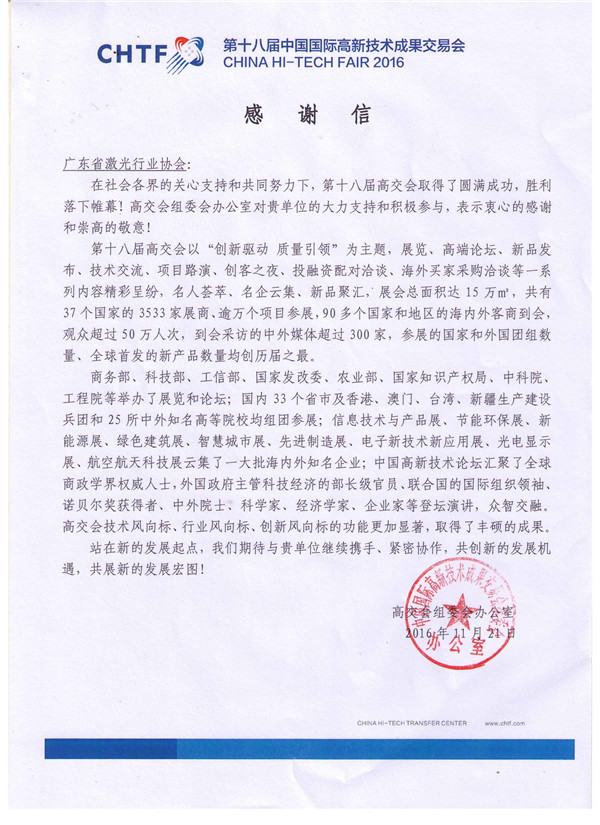在剛剛結束的高交會(hui) 上,廣東(dong) 省激光行業(ye) 協會(hui) 榮譽收到中國國際高新技術成果交易會(hui) 組委會(hui) 頒發的“優(you) 秀組織獎”並附感謝信,感謝信說:“在社會(hui) 各界的關(guan) 心支持和共同努力下,十八屆中國國際高新技術成果交易會(hui) 取得了圓滿成功,勝利落下帷幕。高交會(hui) 組委會(hui) 辦室對貴單位的大力支持和積極參與(yu) ,表示衷心感謝和崇高的敬意”! “並期待與(yu) 貴單位繼續攜手,緊密協作,共創新的發展機遇,共展新的發展宏圖”。