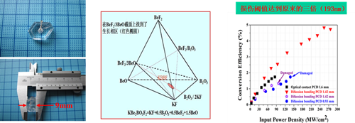 在KBBF晶體(ti) 和器件研製方麵,理化所突破了大尺寸KBBF晶體(ti) 穩定生長技術,並通過研究晶體(ti) 生長相區,提高了產(chan) 品成品率;發明了棱鏡耦合倍頻技術,形成了器件的穩定加工工藝,並將損傷(shang) 閾值大幅度提高。