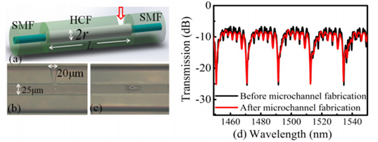 圖 (a)傳(chuan) 感器結構示意圖,(b) 和(c)飛秒激光鑽孔加工後側(ce) 麵和端麵圖,(d)空芯光纖長度為(wei) 5mm的傳(chuan) 感器飛秒激光鑽孔處理前後光譜圖。