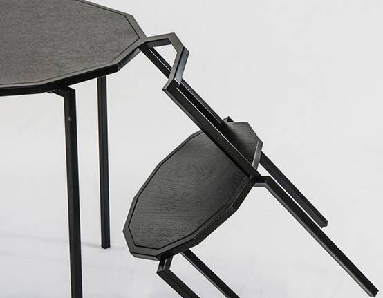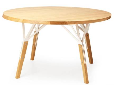如果上一款桌椅太過深沉,那麽這款簡約的圓形桌會不會俘獲你的心呢。桌腿由輕木和激光切割彎曲鋼板組成,並連接到桌麵。激光切割的鋼板堅實有力的支撐著桌子,獨有的設計感有別有傳統的木桌。