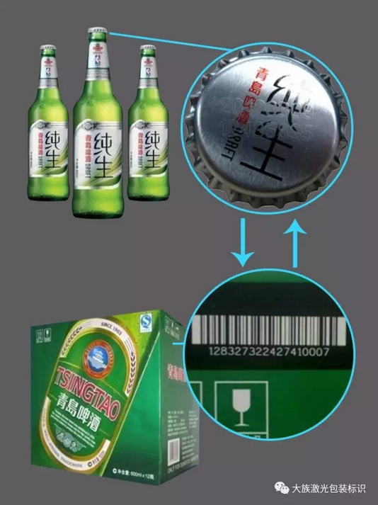 在客戶生產(chan) 現場,應用大族激光於(yu) 2010年成功開發的啤酒整箱大幅麵賦碼應用,在啤酒瓶蓋上標記字符串,同時在紙箱外標記一維條碼。這個(ge) 技術能為(wei) 企業(ye) 實現最小包裝防偽(wei) 、防竄貨、質量追溯提供有力的標識技術保障。