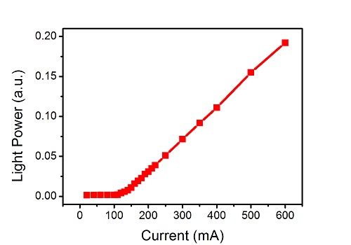 趙德剛研究員帶領的團隊長期致力於GaN基光電子材料和器件研究,對材料生長機理、材料物理和器件物理有自己的理解和認識,發現和解決了一係列激光器的關鍵問題:掌握了InGaN量子阱局域態調控和缺陷抑製方法,提高了發光效率;闡明了碳雜質的補償機製,獲得了高質量的p-GaN材料;設計出優化的器件結構,減小了吸收損耗和電子泄漏;利用變程跳躍的物理機製,實現了良好的p-GaN歐姆接觸;解決了同質外延中襯底翹曲的難題,采用MOCVD生長出高質量的器件結構。在此基礎上,與中科院蘇州納米所進行工藝合作,最終實現了GaN紫外激光器的室溫電注入激射。條寬為10 μm、腔長為600 μm的激光器閾值電流密度為1.6-2.0 kA/cm2,激射波長為392-395 nm,連續激射輸出光功率可達80 mW。圖1為紫外激光器的激射光譜,圖2為P-I曲線,圖3為紫外激光器激射時照到複印紙上形成的藍色熒光光斑(紫外光人眼看不見,紫外激光照到複印紙上會發出藍色熒光)。