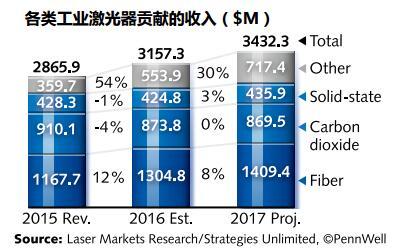 預計 2017 年製造業(ye) 的狀況將是 2016 年的翻版,一些市場(東(dong) 亞(ya) 、南美和東(dong) 歐)的增長會(hui) 繼續放緩。預計工業(ye) 激光器市場將實現 8.7%的收入增長。從(cong) 打標市場來看,隨著單位價(jia) 格的繼續下降,打標激光器的收入將會(hui) 下降;在微加工方麵,隨著準分子激光器的出貨量持續增加,以及非金屬加工的重要性不斷提升,微加工激光器的收入將增長 38% ;在宏觀加工方麵,預計 2017 年宏觀加工仍將占據工業(ye) 激光器市場總收入 47%的份額,與(yu) 2016 年持平,其中光纖激光器市場將增長 8%。