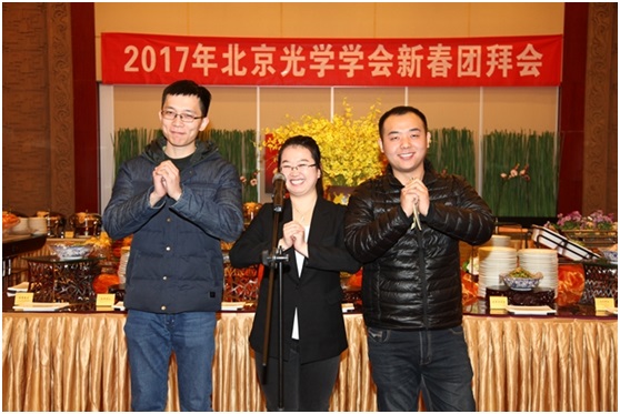 圖6、北京光學學會(hui) 九所高校研究生分會(hui) 的代表,北理工分會(hui) 副主席餘(yu) 興(xing) 堯(左)、北工大分會(hui) 主席韓影(中)、北工大分會(hui) 副主席繆誌明(右),代表首都光學界高校青年學子向出席團拜會(hui) 的老前輩、各位專(zhuan) 家、全體(ti) 來賓拜年!