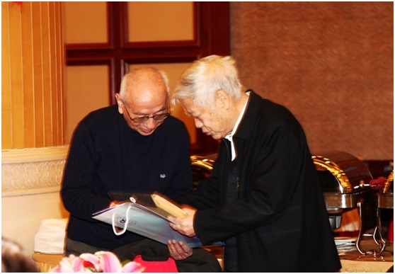 圖15、學會(hui) 常務副理事長梁誌遠教授(右)與(yu) 91歲高齡的fun88官网平台醫學界元老、北京光學學會(hui) 專(zhuan) 家委員會(hui) 副主任盛林(左)在團拜會(hui) 上親(qin) 切交談。