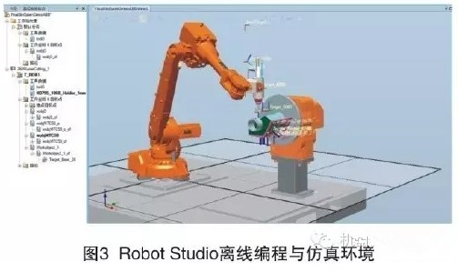 Robot Studio是ABB開發的離線編程與仿真軟件,可在電腦上完成幾乎所有的機器人編程與仿真。如圖3所示,通過Robot Studio能夠實現十分逼真的模擬,並且所用的均為實際使用的機器人程序和配置文件。配合ABB Absolute Accuracy校正係統,可以使模擬結果達到很高的精度。Robot Studio還可方便地導入IGES、STEP、CATIA等主流CAD格式數據,然後依據這些精確的數據編製機器人程序。使用軟件中的AutoPath功能,僅在數分鍾之內便可自動生成跟蹤加工曲線所需要的機器人位置(路徑),很好地解決了激光切割中複雜切割曲線無法通過示教產生的問題,大大節約了編程時間。