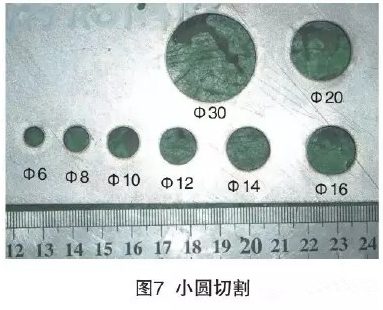 3) 高質量的激光切割效果除了要求機器人自身應具有很高的運動軌跡精度外,良好的切割工藝也是必備因素。切割工藝涉及到切割速度和加速度、激光功率、焦點位置、吹氣量等多種因素的綜合調節。圖7為工藝調整後切割出的小圓,直徑分別為Φ6,Φ8,Φ10,Φ12,Φ14,Φ16,Φ20,Φ30,可以看出切割後的小圓熱變形很小,邊緣光潔,無明顯缺陷。經測量,小圓的軌跡誤差約為0.1~0.25 mm,說明基於ABB機器人的激光切割係統具有很高的運動精度和切割精度。