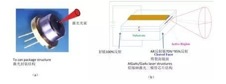 激光二極管(LD)的構造如圖四(a)所示,外觀呈圓柱形,通常會依照封裝的不同而有不同的形狀,但是真正發光的部分隻有「芯片(Die)」而已,芯片的尺寸與海邊的一粒砂子差不多,這麽小的一個芯片就可以發出很強的光,由於激光二極管的芯片很小,所以一片兩吋的砷化镓晶圓就可以製作數千個芯片,切割以後再封裝,形成如圖四(b)的外觀,激光二極管的製程與矽晶圓的製程相似,都是利用黃光微影、摻雜技術、蝕刻技術、薄膜成長製作。