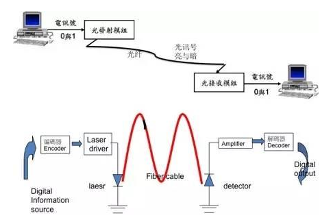 由於一般數據的處理與運算都是使用計算機,計算機是使用電訊號處理數據,所以當我們要將數據傳送到光纖網絡時,必須先將電訊號轉換成光訊號,如圖五 所示,圖中傳送端「光發射模塊(Transmitter)」的功能就是將電訊號轉換成光訊號,我們可以想象成它是將電訊號的「0」與「1」轉換成光訊號的「暗」與「亮」,光訊號在光纖中經過了數百公裏的傳送以後,到達接收端,這個時候必須將光訊號轉換成電訊號,