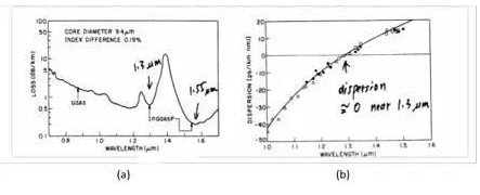 回到主題了,現在開始介紹激光二極管,激光二極管用波長來分類,應用會有很大的差別,目前可見光激光大部分應用在光儲存光照明與光顯示,紅外光大部分用在光通信與光感應,為什麽光通信大部分使用紅外光激光呢?如圖六(a)所示,由於光纖在紅外波段的衰減最小,尤其是在1550nm波段,而1310nm波段雖然衰減沒有1550nm小,但是因為在這個波段色散最小,如圖六(b),所以1310nm波長的激光也常常用於中長距離光纖通訊用光源。而紅外的850nm與980nm光源也被使用於較短距離的末端網絡係統,由於用量大,要求低,所以也常常用紅外LED代替激光。