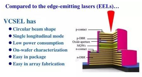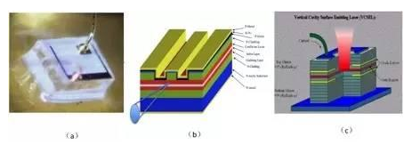 圖七(c)是VCSEL的結構圖,VCSEL是垂直共振腔麵射型激光(Vertical-Cavity Surface-Emitting Laser)的簡稱,是一種半導體激光,其發光垂直於頂麵射出, VCSEL芯片相比邊射型激光二極管,工藝比較簡單,如圖七(b)所示,VCSEL與激光由邊緣射出的邊射型激光二極管有所不同。