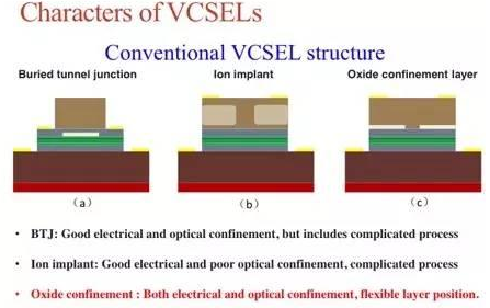 圖十(a)為第一種結構,掩埋隧道結VCSEL由於結構複雜,而且需要使用分子束外延MBE製造,量產困難,目前僅止於學術研究。在上世紀90年代前期,電子通訊公司較傾向於使用離子植入的VCSEL。如圖十(b)所示,通常使用氫離子H+植入VCSEL結構中,除了共振腔以外,其它區域用離子植入破壞共振腔周圍的晶格結構,使電流被限製,缺點是光限製效果不好。所以上世紀90年代中期以後,這些公司們紛紛進而使用氧化型VCSEL的技術。如圖十(c)所示,氧化型VCSEL是利用VCSEL共振腔周圍材料的氧化反應來限製電流,因此在氧化型VCSEL中,電流的路徑就會被氧化共振腔所限製。