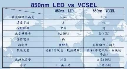 表一 850nm的LED與VCSEL的性能與特性比較表