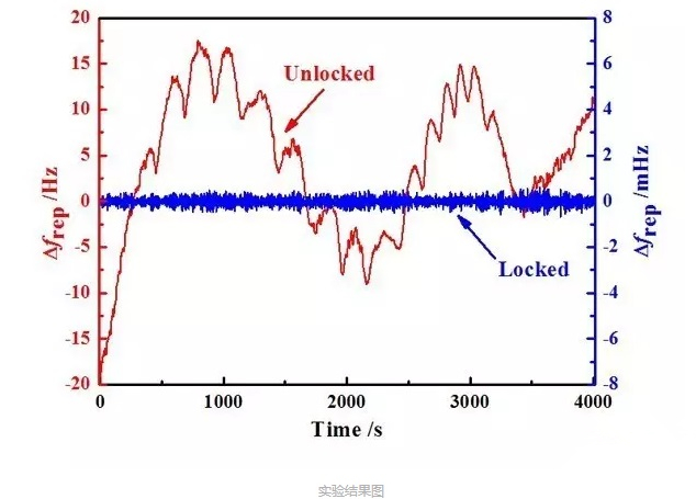 實驗進一步比較了自由運轉與(yu) 重頻鎖定狀態下激光器重頻的變化情況,如上圖紅色和藍色曲線所示。可以看出,由於(yu) 環境溫度變化,激光器重頻自由漂移範圍為(wei) ±20 Hz。