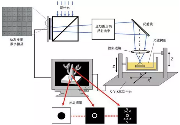 在製造所設計的負膨脹超材料結構時,麻省理工學院的研究人員采用了投影式微立體光刻(Projection Micro-StereoLithography,PµSL)3D打印技術,其原理如圖2所示。工作時,先將不同材料的液滴噴在一個透明窗口上,再通過數字投影機把圖案分別投射在需要固化的液滴背麵,被光照過的區域就形成固體片狀結構,附著在一個樣品支架上,窗口上沒有曝光的液滴則被清除,如此反複,可以得到所需的複合材料。