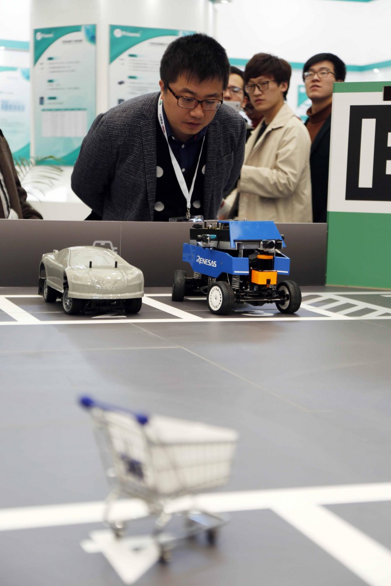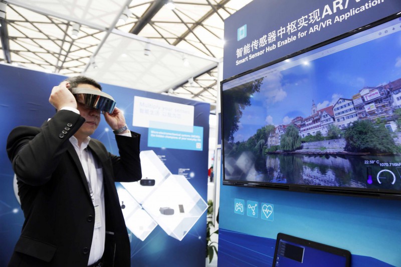 1、圖為(wei) 博世集團展示的智能傳(chuan) 感器中樞實現AR(增加現實)、VR(虛擬現實)應用,一位展商戴上眼鏡體(ti) 驗。