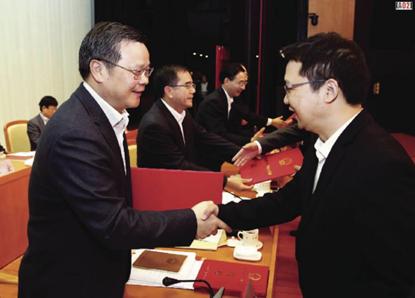 圖為(wei) 東(dong) 莞市委書(shu) 記呂業(ye) 升給正業(ye) 技術總監梅領亮頒獎