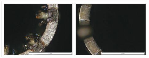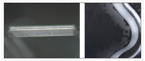 圖四:超快激光切割細304 不鏽鋼管。圖左為(wei) 管子方形槽全貌,圖右為(wei) 管子對麵內(nei) 壁。