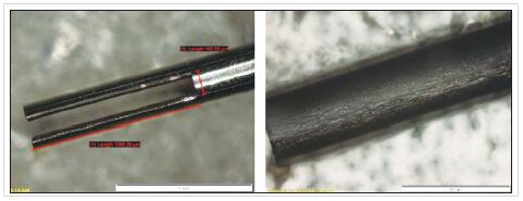圖二為(wei) 光纖激光和超快激光切割的鎳鈦合金支架軸向比較圖,圖左的支架由光纖激光切割,圖右的支架則由超快激光切割。從(cong) 圖中可以看見光纖激光切割的支架內(nei) 壁上熔渣的尺寸甚至大過管壁的厚度,且由於(yu) 熔渣阻礙,無法將落料移除,需要先研磨才可將之去除。研磨內(nei) 壁不僅(jin) 費工費時,而且容易磨出豁邊,造成機械性能的下降。如圖右所示,由超快激光所切割的支架,不但沒有熔渣而且表麵光滑。