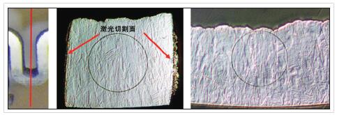 圖五:超快激光切割的316L 不鏽鋼支架的金相觀察。圖左為(wei) 金相 截麵位置示意圖,圖中為(wei) 不鏽鋼支架金相,圖右為(wei) 未加工的316L 不鏽鋼管金相