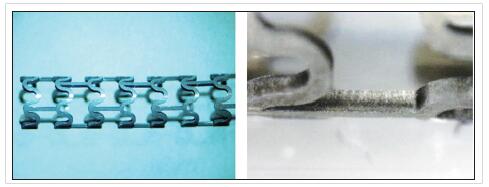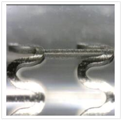 利用金相顯微鏡從(cong) 支架截麵觀察金相,可以看出熱效應是否存在,熱效應會(hui) 改變金屬晶粒的大小,因此若熱效應存在,則位於(yu) 切割邊緣附近的晶粒大小會(hui) 與(yu) 本體(ti) 的晶粒不同。圖五為(wei) 一超快激光切割的316L 不鏽鋼支架。如圖左的紅線所示,金相觀察的截麵為(wei) 支架的彎角,該處圖形最複雜,為(wei) 熱最不易散去的地方。圖中為(wei) 支架截麵的金相,圖右則是作為(wei) 對照觀察的未加工過的316L 不鏽鋼管。晶相從(cong) 支架與(yu) 對照的比較看不出差異,且支架的晶相連續,切割邊緣無不同的晶相存在,表示以超快激光切割的該支架不存在熱效應。圖四為(wei) 支架的局部照片。