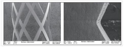 圖八的電子顯微鏡照片是以超快激光切割的鎳鈦合金支架。從(cong) 圖右的局部照片可以看到,沒有任何熔渣或毛刺。
