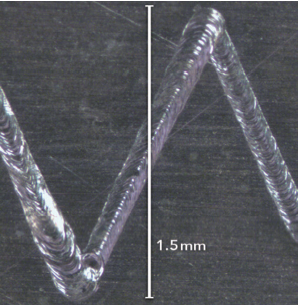 接下來的測試包含使用更長焦、254mm的掃描振鏡焊接100μm不鏽鋼箔片。通過振鏡很容易獲得兩塊100μm302不鏽鋼箔片間焊縫質量良好,在聚焦鏡上下8mm通過調整焊接速度會增加焊縫寬度和強度。采用這種聚焦係統時,焊接工藝很容易受到焦點位置的影響,而且如果係統組裝需要獲得不同質量的焊縫,自動化的需求可以被極大地簡化。