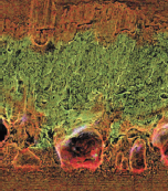 圖4顯示的是磷青銅與不鏽鋼焊接的掃描電子顯微鏡(SEM)成像。在這個實驗中,針對磷青銅一側的焊接界麵進行過失效測試,結果發現,富含鐵(圖中綠色部分)的焊接基材熔入韌性剪切帶失效的磷青銅並被包圍。