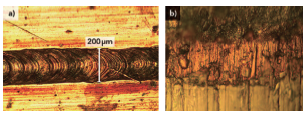 磷青銅憑借高強度被廣泛用於替代銅,而且焊接磷青銅和黑金屬的能力非常重要。圖5a 中的平滑的焊珠頂部說明鑰匙孔焊縫相當的穩定。焊縫表麵失效(圖5b)說明富銅層的韌性破壞轉移到了下層不鏽鋼表麵。