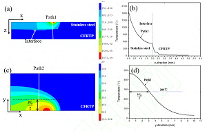 寧波材料所先進製造技術所激光與智能能量場製造團隊與北京大學深圳研究院合作,對CFRTP/異質金屬結構的激光連接機理和工藝進行了研究。利用激光直接連接技術實現了CFRTP與不鏽鋼的連接,研究了界麵狀態對CFRTP/不鏽鋼激光連接質量的影響規律,對接頭的連接機理和失效機製進行了分析,同時對缺陷控製工藝進行了探索性研究,相關成果發表在Journal of Materials Processing Technology上;在考慮CFRTP/不鏽鋼界麵接觸熱導率的基礎上建立了激光連接熱熱效應數學模型,利用有限元方法對連接熱效應進行了仿真計算,分析發現該模型可準確表征夾具壓力對激光連接質量的影響,較傳統數學模型可有效提高熱效應仿真的準確性,相關研究發表在《fun88官网平台》 (2017,44(4):0402002.)上;通過對金屬界麵進行微織構處理可顯著提高連接強度,申請發明專利2項,授權1項(熱塑性複合材料焊接方法CN201510014414.4)。