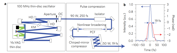 這是2016年Jena 耶拿大學Tunnermann課題組的工作,通過級聯的光譜展寬,利用660W的光纖放大光,經啁啾鏡壓縮後實現了216W、6.3fs的脈衝輸出,重頻127MHz。這個脈寬即使和常規的鈦寶石展寬壓縮後的脈寬相比,也毫不遜色。