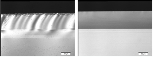 圖 1.機械切割玻璃(左圖)與(yu) 激光切割玻璃(右圖)比較。圖中顯示,機械切割玻璃存在相當大的殘餘(yu) 應力,並且切割過程留下了大量碎屑。
