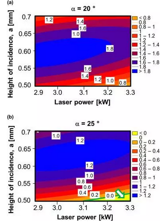 Nikolai Kashaev等人對Ti-6Al-4V對接接頭和T接頭進行Nd:YAG單麵激光焊接工藝進行了研究,使用合金兼容的填充焊絲(si) 來避免底部填充和咬邊。他們(men) 使用二次回歸建立了“非焊接皮”寬度與(yu) 激光功率、入射角和入射高度的關(guan) 係,通過合理的參數優(you) 化,獲得了具有低孔隙率和適當幾何形狀的焊縫。優(you) 化結果如圖2.2所示。