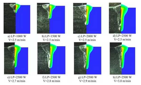 在功率恒定的情況下,焊接速度的增加導致加熱時間過短,不足以產(chan) 生顯著的熔池深度。在高焊接速度下,模擬結果與(yu) 實驗數據一致。由於(yu) 在較低速度下,光束在匙孔內(nei) 多次反射,吸收率增加,模擬略微不同於(yu) 實驗。熱影響區隨著焊接速度的增加而減小。