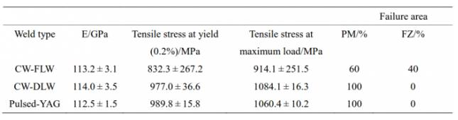 研究表明Nd:YAG激光器加工後的焊接質量高於(yu) 用光纖激光器或二極管激光器產(chan) 生的焊縫。三種焊接類型的硬度值非常相似。但是強度和塑性不同,這主要是受到不同類型孔的焊接缺陷的影響。三種焊接形式的力學性能如表4.2所示。