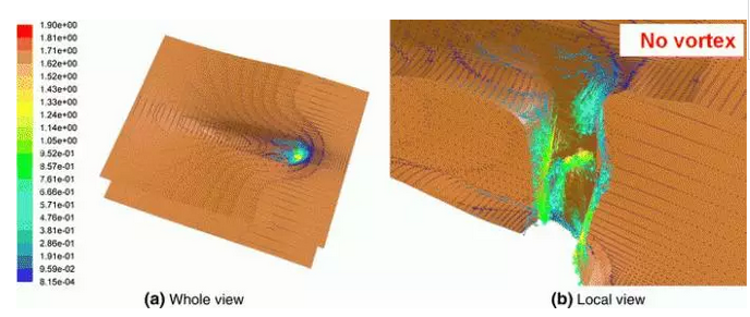 對於(yu) 較低功率,較低速度的焊接,匙孔後麵的流體(ti) 流動是湍流和不穩定的,並且形成渦流。預測熔融金屬從(cong) 熔池的中心麵流走,並且在熔池中,匙孔的後麵留下間隙或空隙。對於(yu) 較高功率,較高速度的焊接,流體(ti) 流動並不湍急,不形成這種渦流。模擬預測的工件表麵處的流體(ti) 流速如圖5.3。