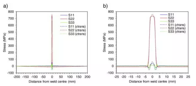 圖5.4 殘餘(yu) 應力分布:(a)在所有三個(ge) 主要方向上,在焊縫附近的整個(ge) 寬度上,(b)橫向(11),縱向(22)和具有及不具有相變的法線方向