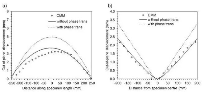圖5.5 模擬(a)翹曲,(b) 有和沒有相變的平麵失真角度的大小