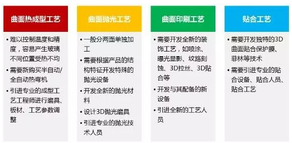 3D玻璃生產(chan) 工藝相較2D、2.5D玻璃有四大難點,曲麵成型、曲麵拋光、曲麵印刷、曲麵貼合。