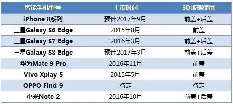 智能手機兩(liang) 大陣營中,安卓係的三星、華為(wei) 、Vivo、OPPO、小米等都已經推出3D 玻璃蓋板的手機型號。市場預計蘋果將為(wei) iphoness8配備3D玻璃蓋板與(yu) 後蓋。