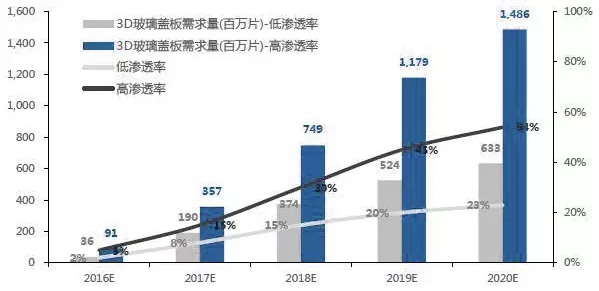 據相關(guan) 機構預測,2020年3D玻璃蓋板年需求量為(wei) 6-14億(yi) 片,滲透率為(wei) 23%-54%。