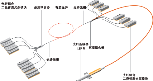 圖 1:Coherent | Rofin 光纖激光振蕩器原理圖,包括12 個半導體激光 器泵浦模塊和6x1 光纖耦合模塊,後者將泵浦光注入增益光纖,使得激 光束可以高效地輸出。