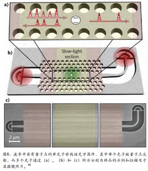 例如,通過將量子點集成到光子晶體(ti) 波導中,丹麥哥本哈根 Niels BohrInstitute 的研究人員能夠證實單光子水平的非線性光學元件——單個(ge) 光子被量子點反射,而多光子將通過(見圖6)。光子間的這種非線性相互作用,使得經典和量子信息技術的邏輯運算成為(wei) 可能,為(wei) 可擴展的基於(yu) 波導的光子學量子計算架構鋪平了道路。