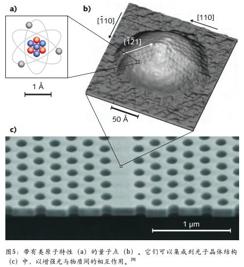 半導體(ti) 量子點在三維尺寸上具有納米尺寸,使得它們(men) 的電子狀態由於(yu) 緊約束而被量化。這些量子點也顯示出其他的類單原子特性,如較強的光子反聚束和近壽命極限的線寬,通常被稱為(wei) 人造原子。它們(men) 是有趣的係統,可用於(yu) 實現量子位,並且由於(yu) 半導體(ti) 加工已被很好地理解,半導體(ti) 量子點是可擴展量子計算機尤為(wei) 有希望的候選者。與(yu) 實際原子不同,半導體(ti) 量子點可以以固態的方式生長,像光子晶體(ti) 腔和波導等其他結構可以在其周圍構建(見圖 5)。