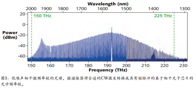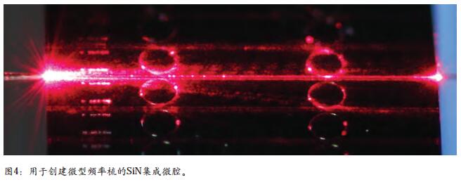 所得到的頻率梳的性質,在很大程度上取決(jue) 於(yu) 泵浦激光波長,因為(wei) CW 激光器可以激發非相幹高噪聲狀態以及孤子態。孤子態是有利的,因為(wei) 所得到的頻率梳是相幹的並且具有極低噪聲、窄線寬和短脈衝(chong) 。如果從(cong) 較高頻率到較低頻率掃描泵浦激光器,將發生不同孤子態間的急變階段。每個(ge) 階段對應於(yu) 在微諧振器中循環的孤子數量的連續減少。通過反饋至激光器,可以在其中一個(ge) 階段穩定微型梳,從(cong) 而允許穩定的孤子操作。圖 3所示為(wei) 由可調諧二極管激光器泵浦氮化矽(SiN ;見圖 4)製成的這種微腔的光學單孤子光譜。