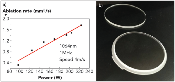 圖5:采用皮秒激光器進行逐層消融加工,用於切割和研磨藍寶石,顯示的是通過功率(a)的體積燒蝕率和藍寶石表蓋(b)的示例。
