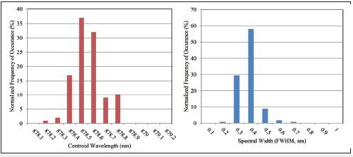圖 4:柱狀圖顯示了 878.6 nm 半導體激光器的中心波長(左)和光譜寬度(右)。泵浦二極管集中輸出波長和收窄光譜寬度的能力可大大提升 Nd:YVO4 激光設備的輸出功率和光束質量。