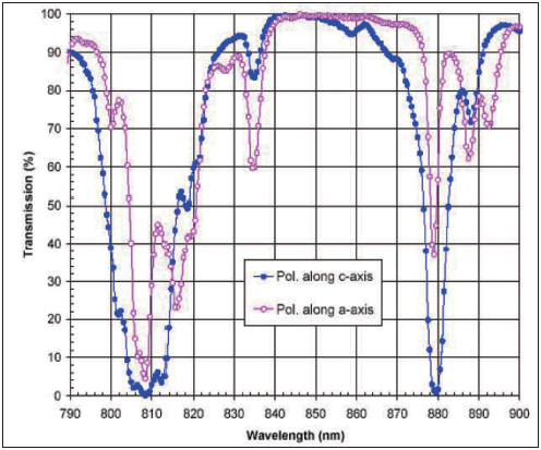 在將泵浦解諧到878.1nm時,低a軸光吸收情況會導致性能不良。較大的光譜寬度(約 1nm)由於a軸吸收的迅速減少會大大削減性能,導致以短波長泵浦的近衍射極限光束質量下降。通過將泵浦調諧到879.1nm以上的波長,強c軸吸收搭配弱a軸吸收會導致低光光轉換效率以及很強的熱透鏡效應。光譜線寬的進一步增加會導致DPSS性能降低。