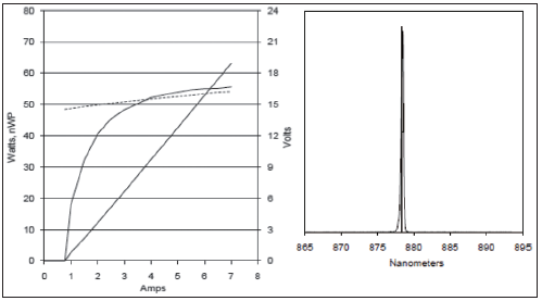 圖 1:性能比較表,自由運行、內部布拉格光柵穩定以及VBG 鎖定半導體激光器的中心波長、光譜線寬以及峰值二極管效率變化的測量值。VBG鎖定裝置在中心波長變化上變化最小,光譜線寬最低,並且在電光轉換效率並無損失。