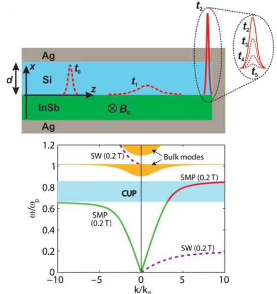 接下來的問題是,如何能使進入和離開諧振係統的能量具有可以自由調節的速率,這是實現非對稱係統設計的關(guan) 鍵。論文中所使用的獨家秘笈就是南昌大學和浙江大學合作研究的磁光材料混合諧振腔/波導係統(見圖2)。利用這種係統,就可以遊刃有餘(yu) 地自由控製反向傳(chuan) 播電磁波的能量傳(chuan) 播速率,在太赫茲(zi) 波段,傳(chuan) 統的時間-帶寬限製已經可以提高上千倍。從(cong) 理論上說,在這些(時間)不對稱係統中根本沒有上限,帶寬不再受製於(yu) 能量的存儲(chu) 時間。